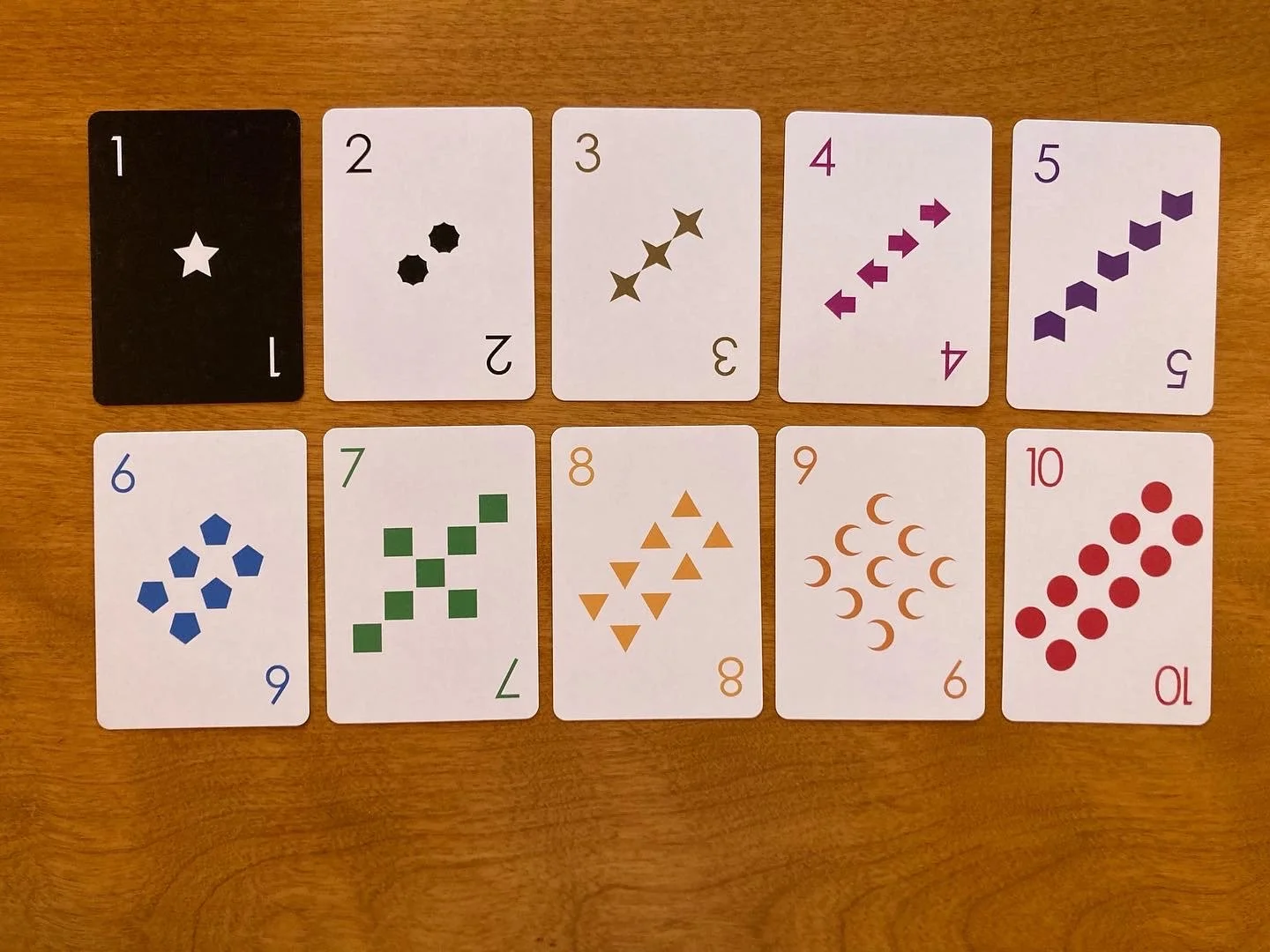 Deciding on ten distinct suits and colors proved to be a challenge. Eventually, I devised a system where the suits count up to ten via the number of vertices in their suit. For example, Suns have one point (they are a point, really), Moons have two points, and so on, all the way down to Stars with ten points.